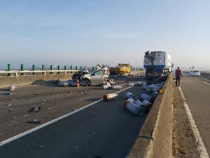 - 事故車輛A車所載運之液態石油氣瓦斯空桶未綑紮穩妥,於事故發生時造成瓦斯空桶散落於台61線道路上。